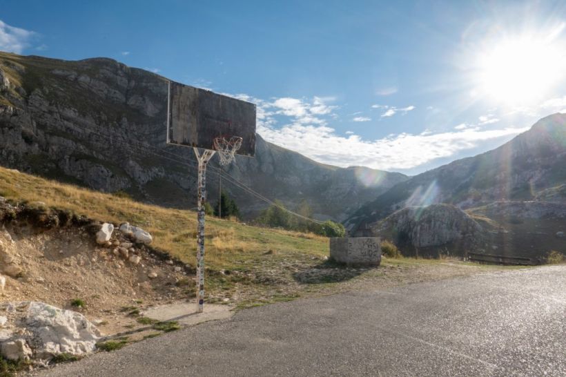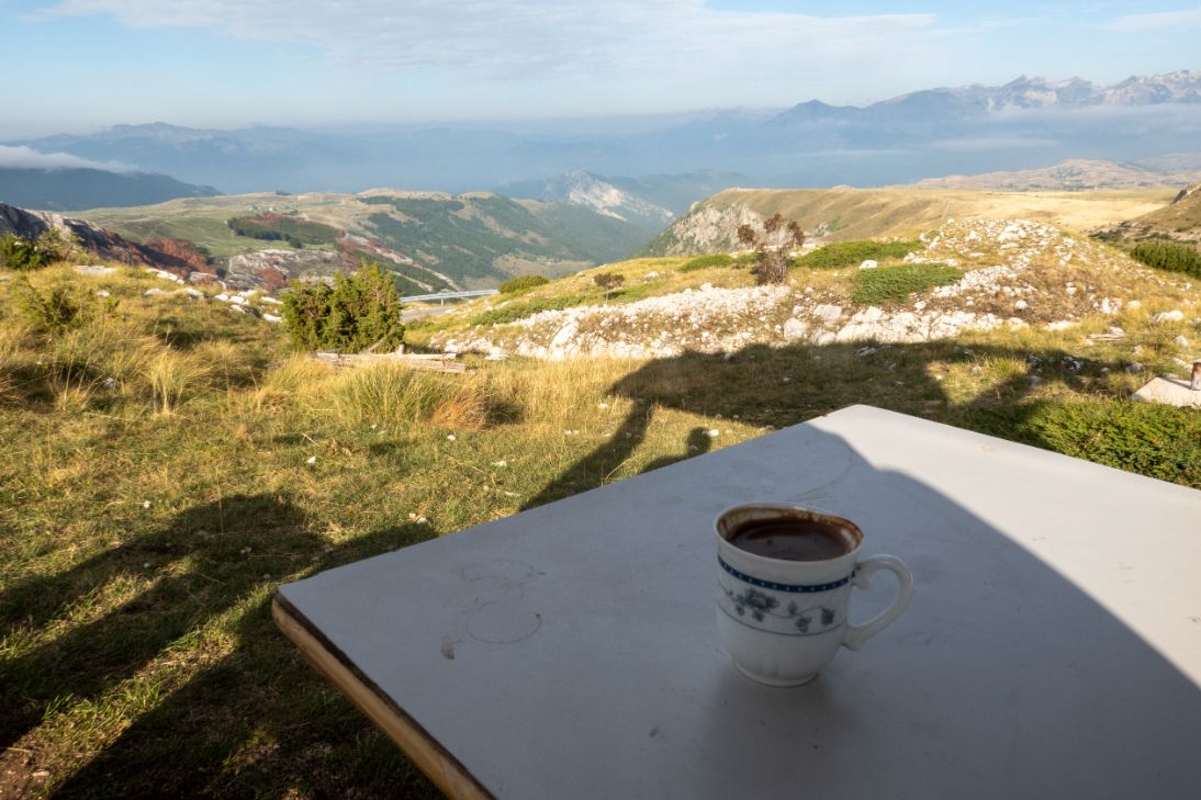 This first section didn’t seem to involve any sheer drops to either side which was incredibly comforting. Sure, the road is tiny but worse case you’d end up with your wheels on some grass rather than spinning on your roof 50 metres lower than where you started. It’s gorgeous. All rolling hills and mountains and low-lying cloud which just added to the majesty. We pulled over a few times to take photos including at a stop with a random basketball hoop, because why the fuck not I guess? Then just around the corner from that was a little hut with a bloke selling Balkan coffee (which is basically Turkish coffee; strong, black, served with the grounds in the bottom so you have to know when to stop drinking to avoid chops full of coffee slop) , souvenirs and local produce. Well it would be rude not to have a coffee with that view wouldn’t it?