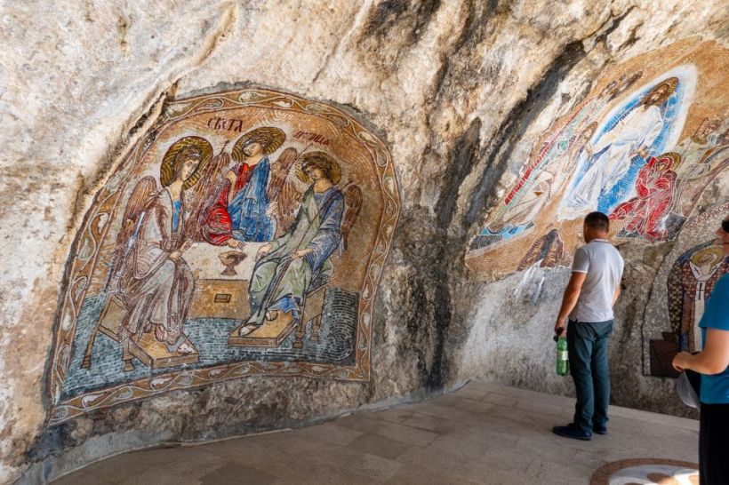 Right! Now for the monastery in the title of this blog post. Ostrog monastery is one of these built-into-the-rock-face type things, high up in the hills. And you know what high up places mean, kids? That’s right! Narrow winding roads on the edge of cliffs to shred a few more of my already tortured nerves. Yay! This was actually one of the scariest roads for me. I do not like heights. All I could see in my peripheral vision as we wound our way up was the vast expanse of nothing to the right of us. The barriers were laughable at best. When we met traffic coming the other way Tarrant had to tell me how much space we had to pull over because I could barely look, then I’d just stop and let the other car do the work. It was utterly terrifying. I think I’d lost enough sweat through my palms to raise sea levels by the time we pulled into the car park.
