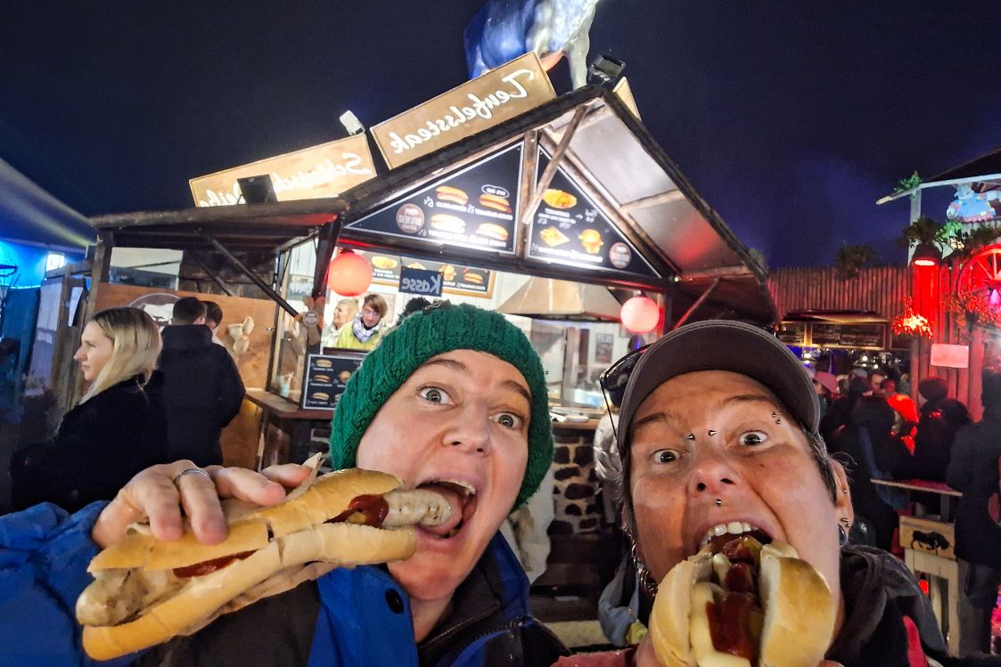 Since we got together over 12 years ago, we’ve built our own little traditions, as those sickeningly in-love couples are wont to do. One of them is that we go to some manner of Christmas market and have a Bratwurst. We call it the Annual Lesbian Sausage Gobble. For the first time ever the yearly comedy consumption of a German sausage took place in actual Germany. What a time to be alive. To be fair, we’d already consumed several Bratwurst, and some manner of dead thing called an Ossenwurst, which is apparently ox — or maybe beef — but not pork. Still, it’s not an official Sausage Gobble until there’s a selfie posted on Facebook is it?