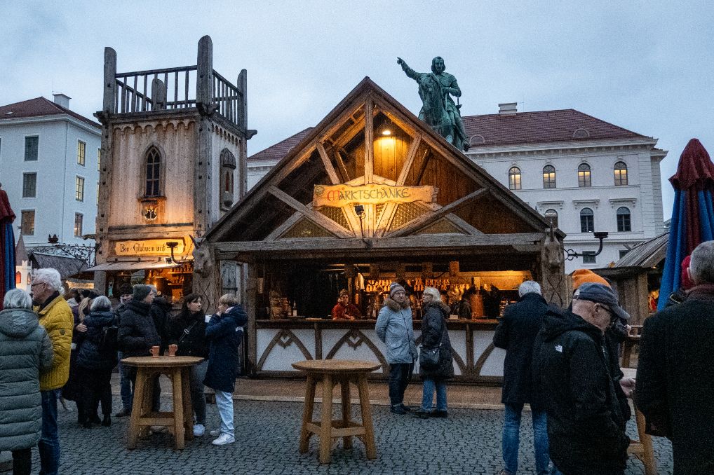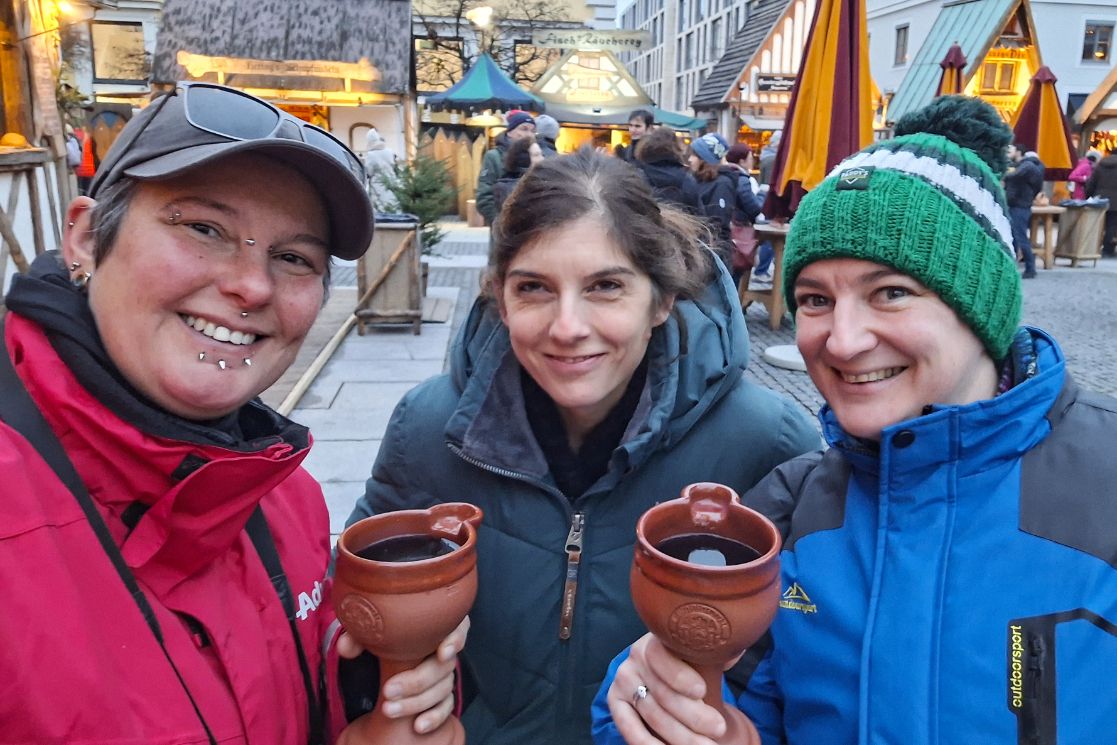 We did wander through other markets during our general touristing but the final one we deliberately went to was the Mittelalterlichen Weihnachtsmarkt (Closest U-Bahn: Odeonsplatz) at Wittelsbacherplatz, which is a medieval themed market. Think leather good, fur garments, drinking horns — everything for the discerning Viking about town. Christmas markets in Munich date back to the 1300’s and this one tries to recreate that vibe but with, like, food safety laws. This is where we tried a Feuerzangenbowle which is mulled wine but you set a rum-soaked sugar cube on fire which sort of caramelises into the drink. It was banging! It also had the biggest cup Pfand because they really, really wanted you to bring your fancy cup back.