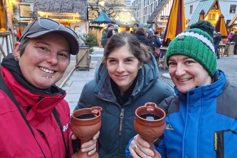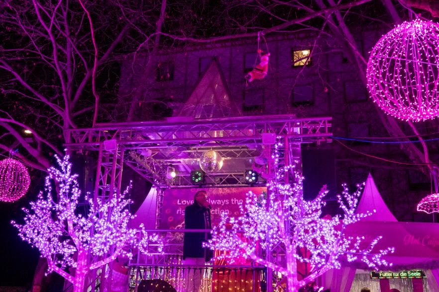 We swung by Pink Christmas, (Closest U-Bahn: Sendlinger Tor) a tiny, queer-friendly market at Stephansplatz and treated ourselves to a weißer Glühwein because this is apparently what we drink now, and we also went back the following evening because it really does come into its own when sun sets. It is pink. It’s unashamedly, completely and utterly pink. They had a live singer on when we rocked up in the evening who was replaced by a DJ but the music wasn’t super loud, likely out of respect for the neighbours. It’s very small and you can buy stuff geared towards the gay community, such as rainbow hot air balloon decorations, and tree ornaments in the shape of scantily clad men. The pink pound does tend to forget that lesbians exist. But they’re actually really well done and if they weren’t, like, €50 a pop we might have bought them for certain friends. We love our mates, but we only €1.50 for a fridge magnet love our mates.